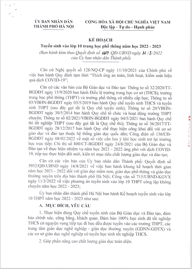 Quyết định số 1117/QĐ-UBND của UBND thành phố Hà Nội về việc phê duyệt Kế hoạch tuyển sinh vào lớp 10 THPT năm học 2022-2023 04 Tháng Tư 2022 :: 8:48 CH :: 557 Views :: 0 Comments :: TIN TUYỂN SINH, HOẠT ĐỘNG CHUNG CỦA TRƯỜNG, TUYÊN TRUYỀN PHÁP LUẬT