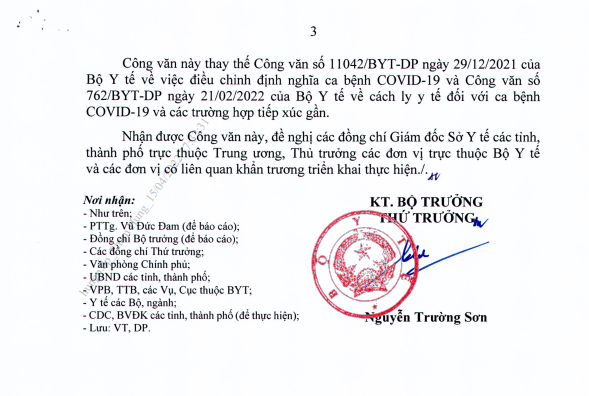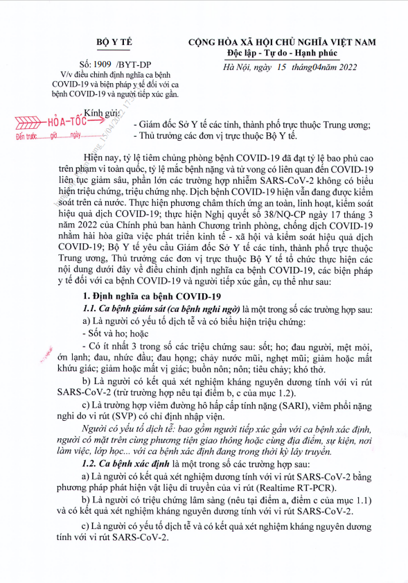 Công văn số 1909/BYT-DP về việc điều chỉnh định nghĩa ca bệnh Covid-19 và biện pháp y tế đối với ca bệnh Covid-19 và người tiếp xúc gần 18 Tháng Tư 2022 :: 10:11 SA :: 962 Views :: 0 Comments :: HOẠT ĐỘNG CHUNG CỦA TRƯỜNG, PHÒNG CHỐNG DỊCH COVID-19