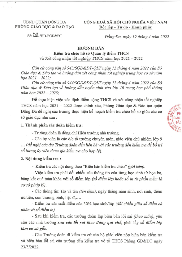 Công văn số 03/HD-PGD&ĐT của PHòng GD&ĐT quận Đống Đa về hướng dẫn kiểm tra chéo hồ sơ Quản lý điểm THCS năm học 2021-2022 24 Tháng Tư 2022 :: 4:04 CH :: 383 Views :: 0 Comments :: HOẠT ĐỘNG CHUNG CỦA TRƯỜNG