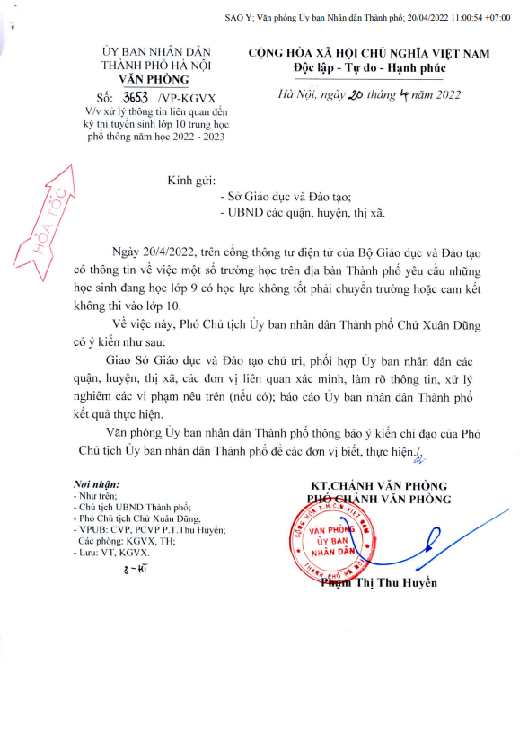 Công văn 3653/VP-KGVX của UBND thành phố Hà Nội về việc xử lý thông tin liên quan đến tuyển sinh lớp 10 trung học phổ thông năm học 2022-2023 24 Tháng Tư 2022 :: 4:22 CH :: 378 Views :: 0 Comments :: HOẠT ĐỘNG CHUNG CỦA TRƯỜNG