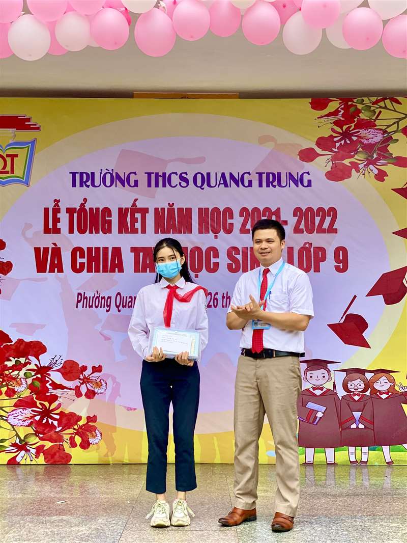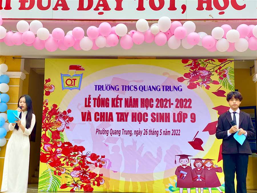 Cũng trong lễ bế giảng, nhà trường đã tổ chức Lễ chia tay học sinh khối 9. Bốn năm học nhanh chóng qua đi, thời gian các em gắn bó cùng mái trường đã sắp kết thúc để chuẩn bị cho một chặng đường dài phía trước, một kì thi đầy thử thách cam go. Hi vọng rằng, với những cố gắng và miệt mài học tập, các em sẽ đỗ vào ngôi trường cấp 3 mà các em mong ước. Mái trường Quang Trung và thầy cô luôn yêu thương và chúc cho tất cả những ước mơ của các em sẽ bay cao bay xa.