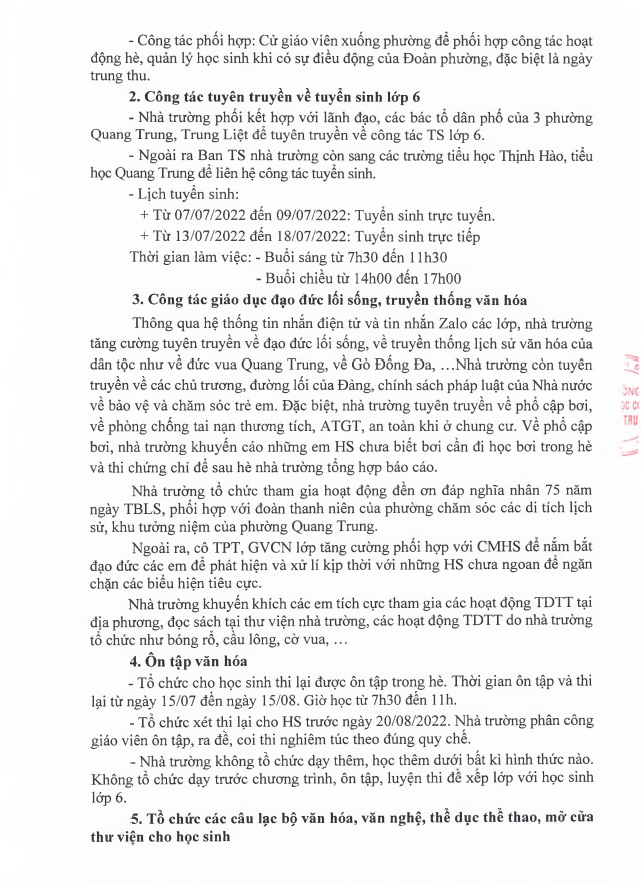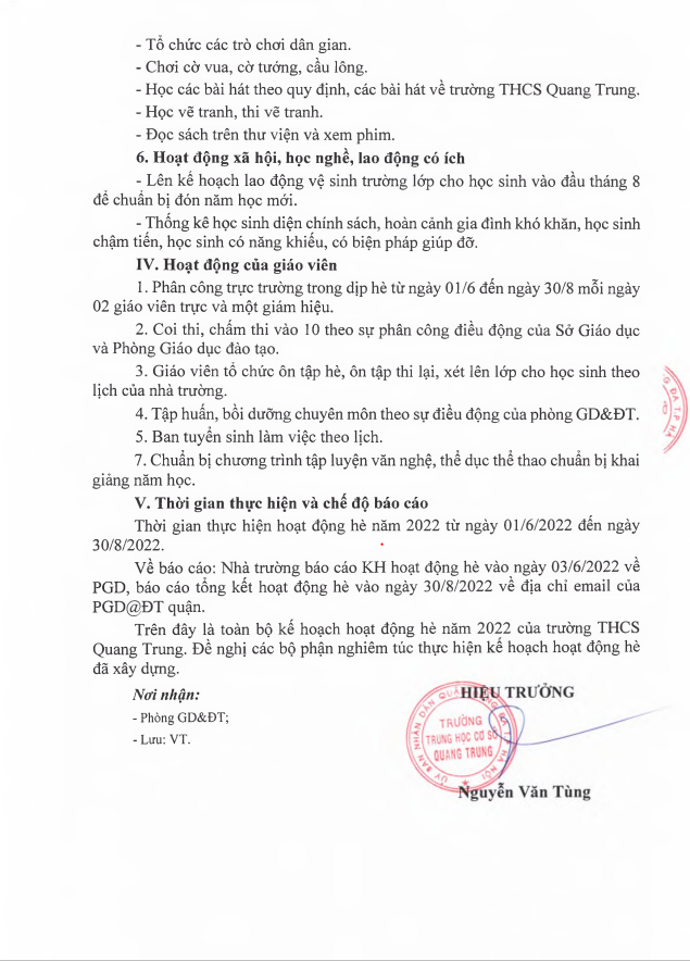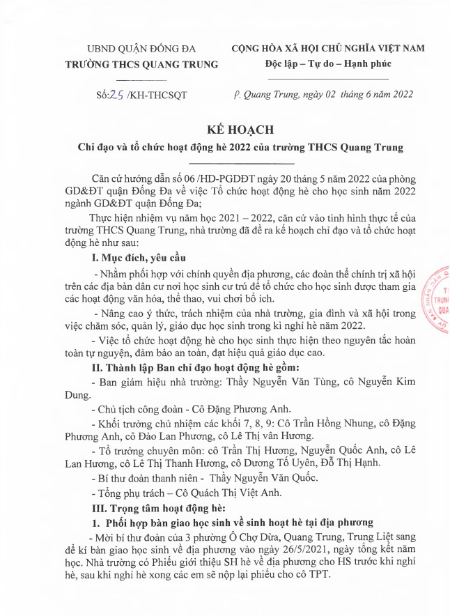 Kế hoạch số 25/KH-THCSQT về chỉ đạo và tổ chức hoạt động hè năm 2022 của trường THCS Quang Trung 04 Tháng Sáu 2022 :: 2:35 CH :: 455 Views :: 0 Comments :: HOẠT ĐỘNG CHUNG CỦA TRƯỜNG