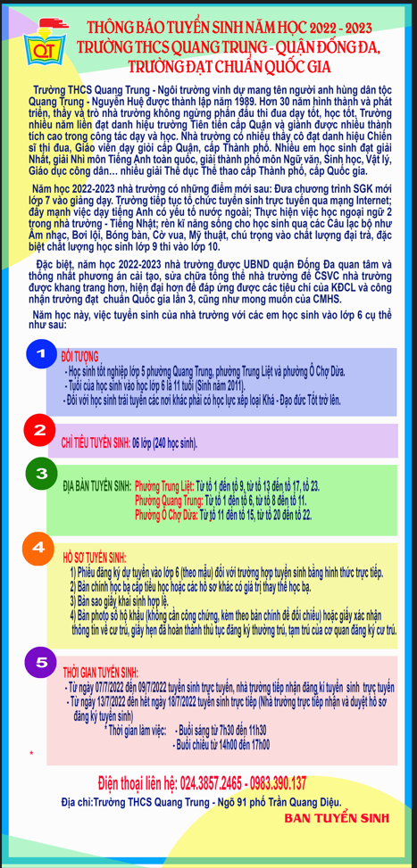 Thông báo tuyển sinh lớp 6 trường THCS Quang Trung năm học 2022-2023 20 Tháng Sáu 2022 :: 3:44 CH :: 1322 Views :: 0 Comments :: TIN TUYỂN SINH, HOẠT ĐỘNG CHUNG CỦA TRƯỜNG