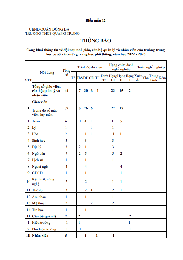 Công khai thông tin về đội ngũ nhà giáo, cán bộ quản lý và nhân viên trường THCS Quang Trung năm học 2022 - 2023 20 Tháng Tám 2022 :: 9:09 SA :: 409 Views :: 0 Comments :: HOẠT ĐỘNG CHUNG CỦA TRƯỜNG