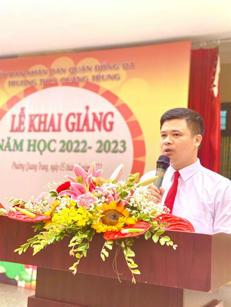 Cũng trong buổi lễ, thầy giáo Nguyễn Văn Tùng đã lên phát biểu, cảm ơn sự đồng hành, giúp đỡ của các các ban ngành đoàn thể phường Quang Trung, phường Trung Liệt, phường Ô Chợ Dừa và đại diện cha mẹ học sinh đã phối hợp với nhà trường trong việc giáo dục học sinh. Năm học 2021-2022 là năm học gặp nhiều khó khăn do chịu ảnh hưởng bởi dịch COVID-19, song thầy trò nhà trường đã phấn đấu nỗ lực thực hiện mục tiêu kép, vừa tổ chức dạy tốt, học tốt để nâng cao chất lượng giáo dục, vừa phòng chống dịch tốt để an toàn, hoàn thành xuất sắc mọi nhiệm vụ được giao. Nề nếp, kỷ cương trường học được giữ vững, chất lượng giáo dục đại trà có sự tiến bộ vượt bậc, chất lượng đội ngũ ngày càng được nâng cao. Thầy giáo cũng đã gửi lời chúc tới toàn thể giáo viên, học sinh nhà trường cố gắng phấn đấu, đạt nhiều kết quả cao trong năm học 2022 – 2023.