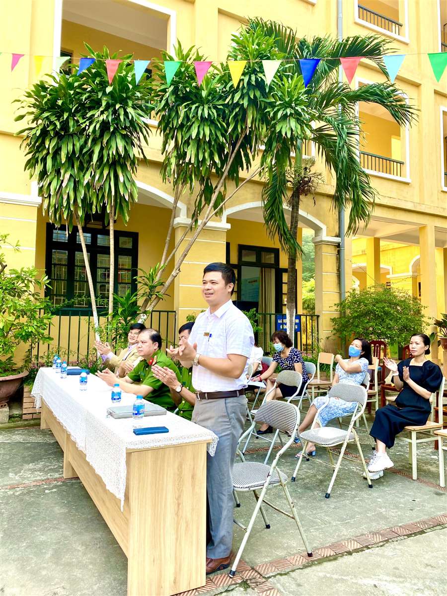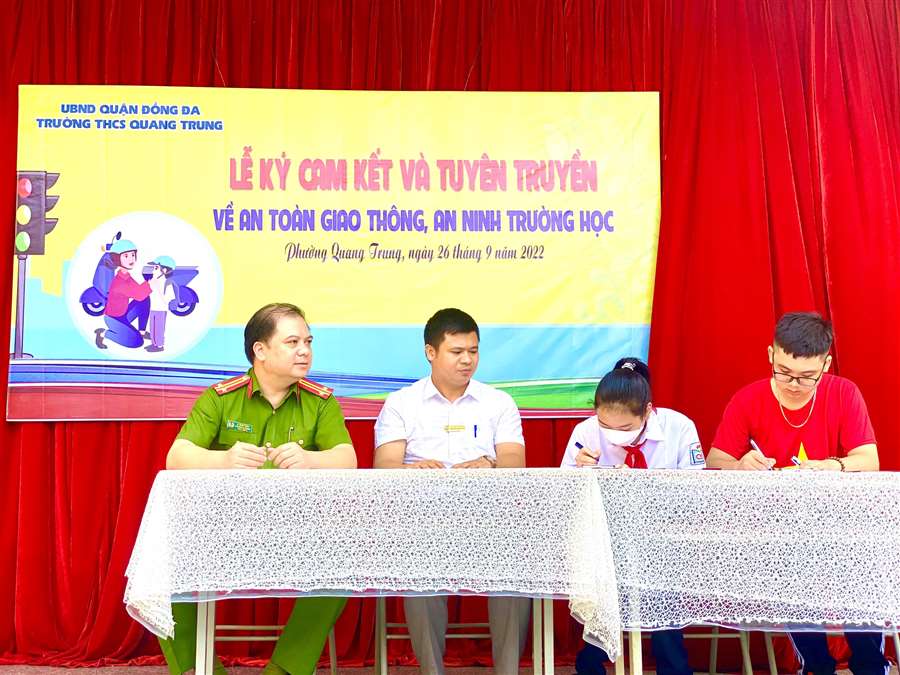 Cũng tại buổi lễ, thầy Nguyễn Văn Tùng và đại diện học sinh các lớp đã cùng kí bản cam kết với đại diện công an phường Quang Trung về việc thực hiện An toàn giao thông của học sinh toàn trường.