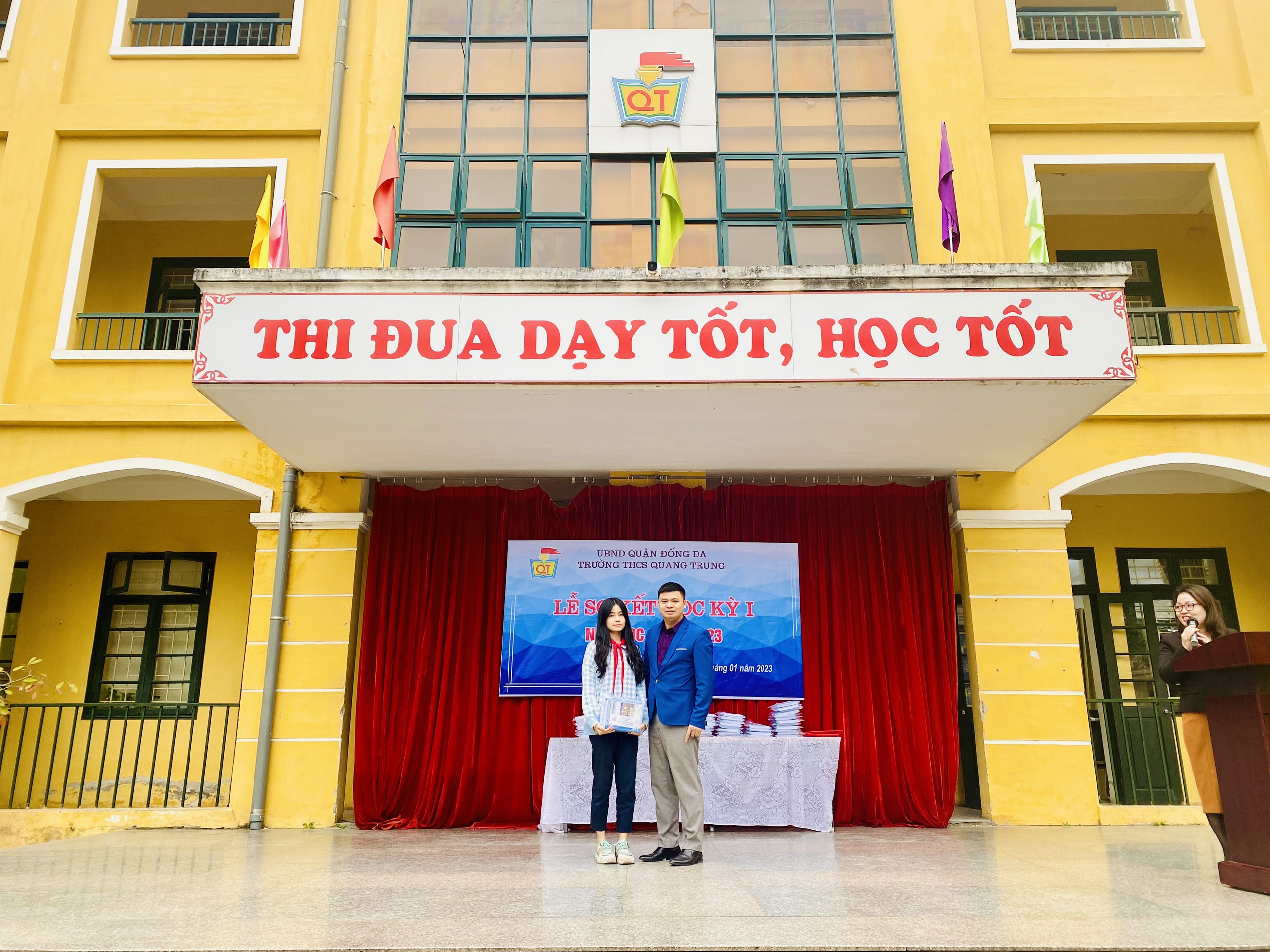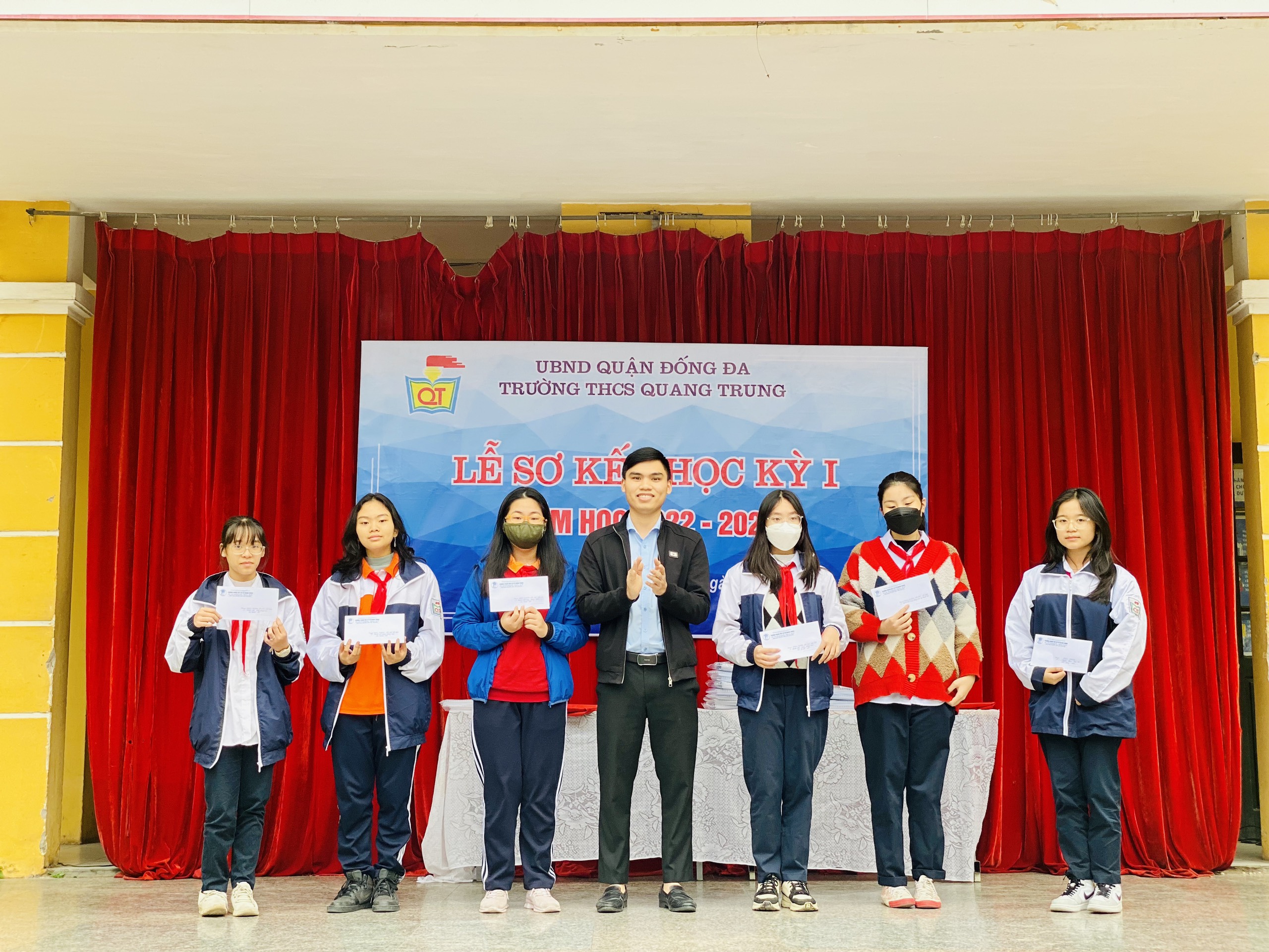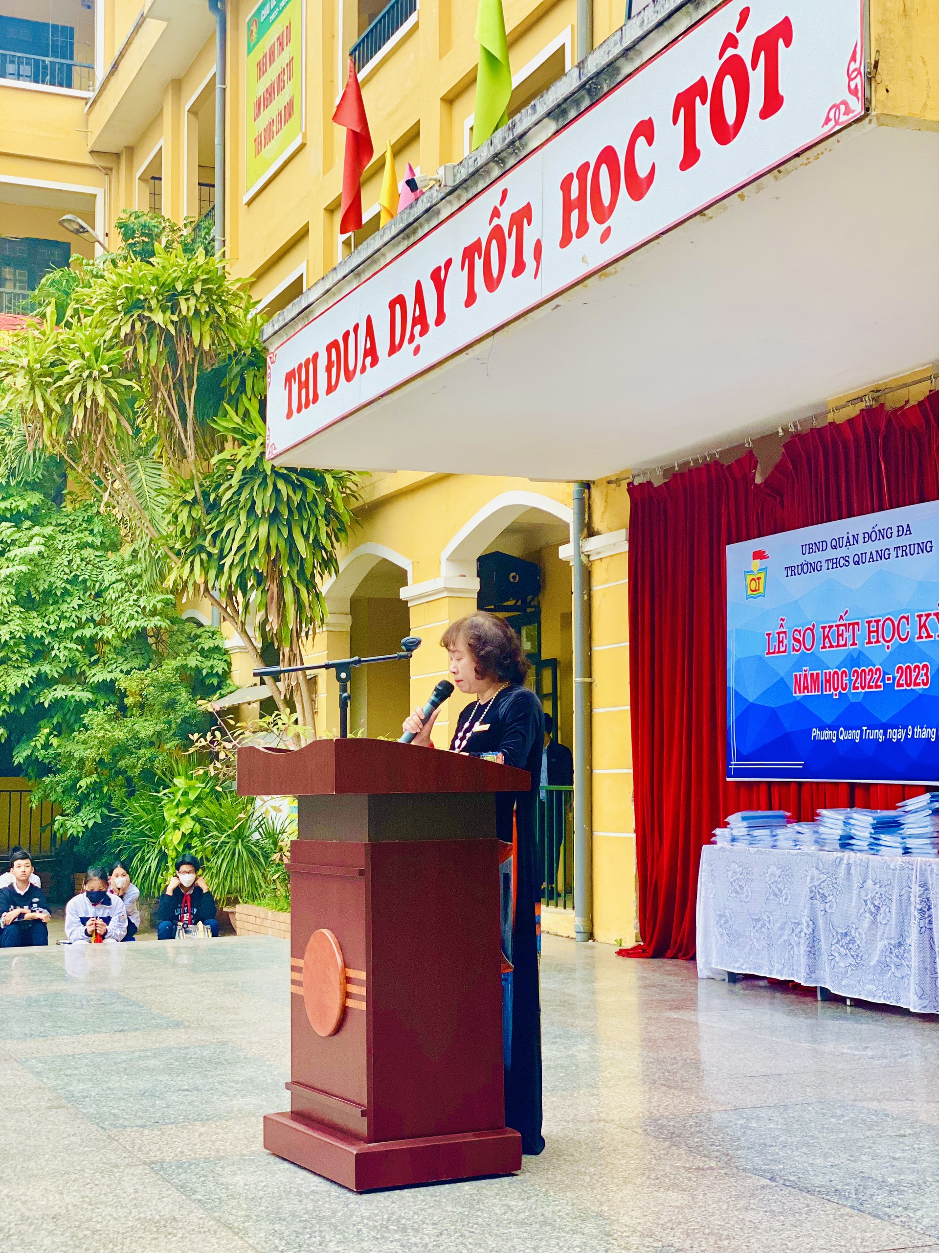 Cô Nguyễn Kim Dung – Phó hiệu trưởng nhà trường đã lên đọc diễn văn sơ kết học kì I năm học 2022-2023. Trong học kì vừa qua, nhà trường đã triển khai nhiều hoạt động thi đua dạy và học, các phong trao văn hóa văn nghệ thể thao. Kết quả, nhà trường đã đạt được nhiều thành tích: Trong cuộc thi Giai điệu tuổi hồng, em Nguyễn Nguyên Lê đạt giải nhất cấp Thành Phố; kì thi Học sinh giỏi cấp Quận khối 9, nhà trường có 6 học sinh đã đạt các giải nhì, ba, khuyến khích ở các bộ môn Ngữ văn, Địa lí, Ngữ văn và Sinh học. Trong cuộc thi Olympic tiếng Nhật có 3 em đạt giải Nhì, 3 giải Ba trong cuộc thi văn nghệ, viết thư pháp. Trong cuộc thi vẽ tranh tuyên truyền kỉ niệm 50 năm chiến thắng “ Hà Nội – Điện Biên Phủ trên không” , em Đỗ Ngọc Ánh – lớp 6N đã vinh dự đạt giải Ba cấp Quận.