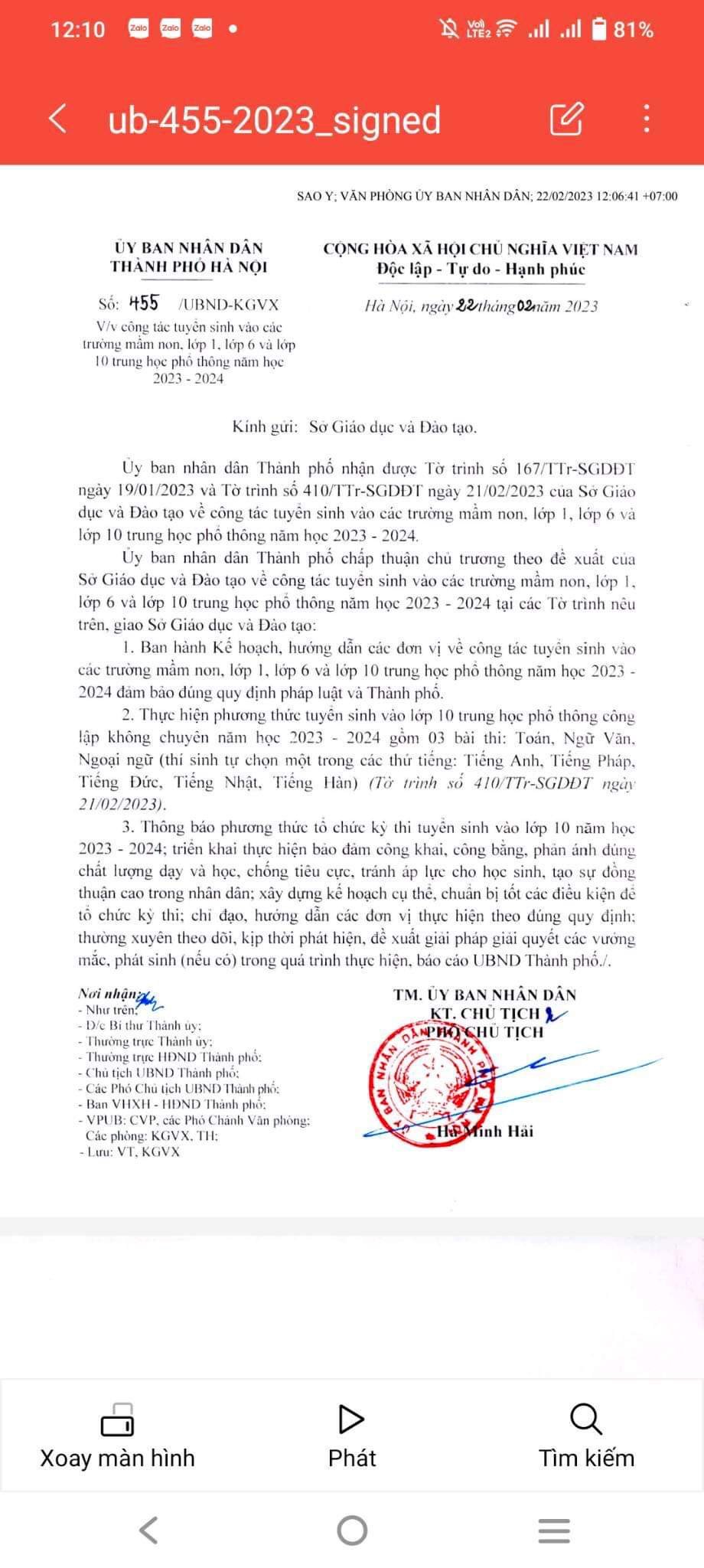 Công văn số 455/UBND-KGVX của UBND thành phố Hà Nội về công tác tuyển sinh vào các trường mầm non, lớp 1, lớp 6 và lớp 10 THPT năm học 2023-2024 24 Tháng Hai 2023 :: 5:08 SA :: 499 Views :: 0 Comments :: HOẠT ĐỘNG CHUNG CỦA TRƯỜNG
